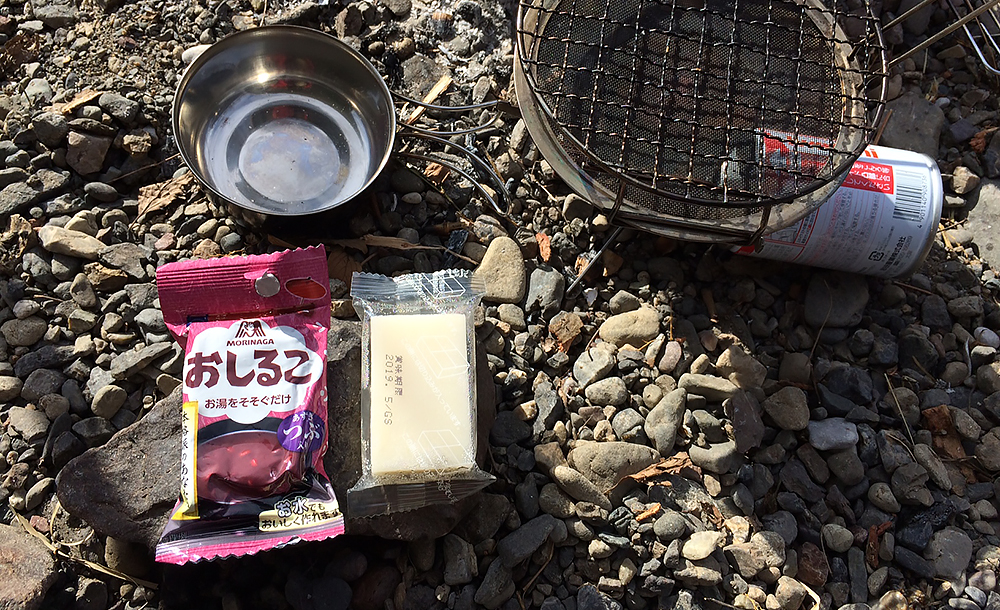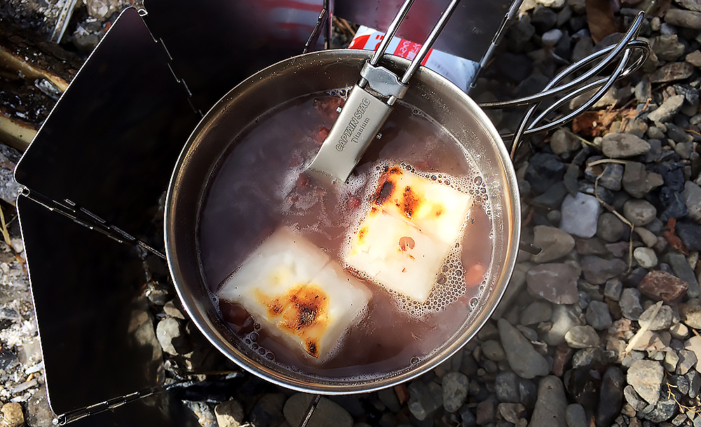 ・インスタントのおしるこ 1袋 ・切りもち 1個 必要な道具: ・火器 一つ ・クッカー 一つ ・焼き網 一枚