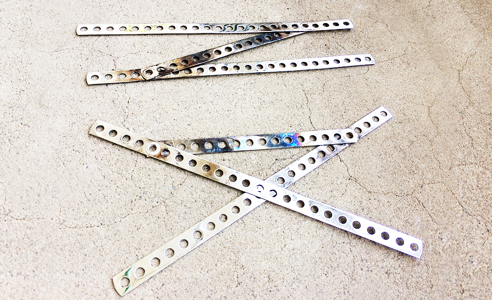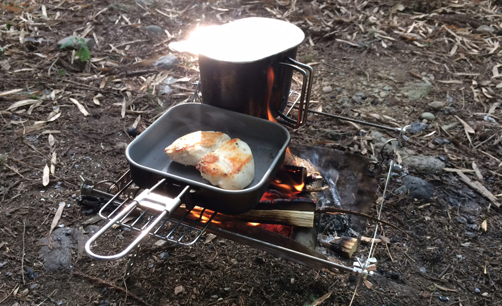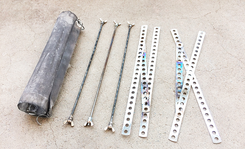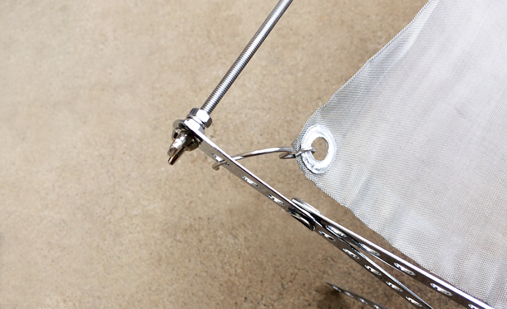 火床部分は、ステンレス網を切って四辺を折り曲げ、四隅にハトメを付けたものです。