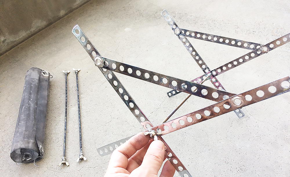 組み立ては簡単。バーの穴に棒ネジを差し込んで蝶ナットでつなぎ、網を穴に掛ければ完成です。