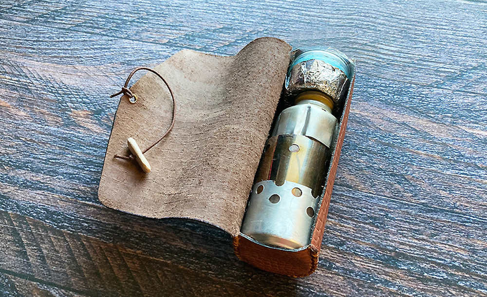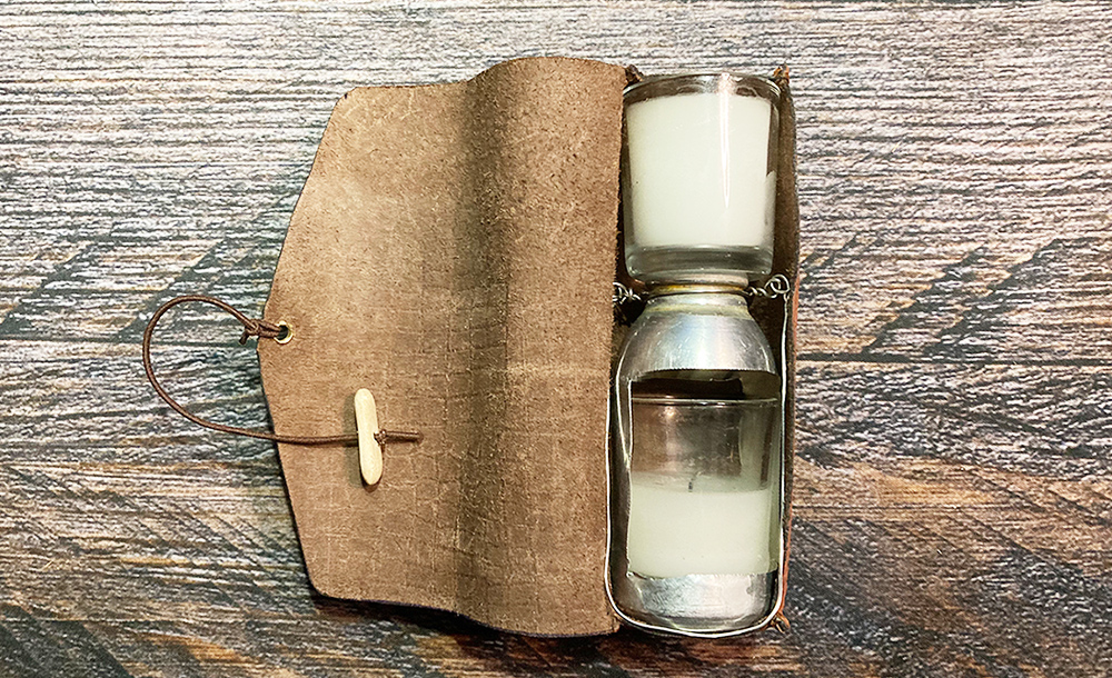 ウコン缶で作ったランタンと予備のキャンドルがちょうど入る大きさ。留め具は枝を削って作成。