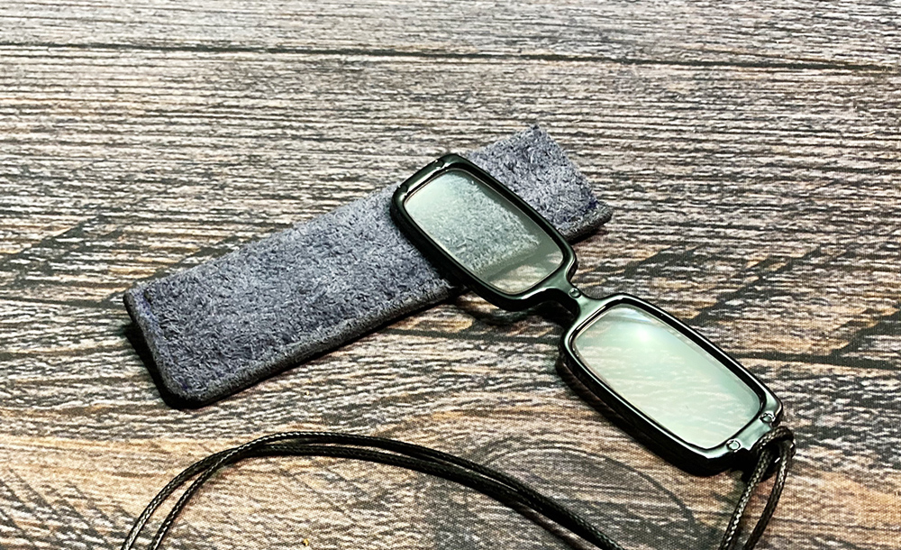 このツル無しの老眼鏡はダイソーで見つけたものです。 キャンプ時、ちょっと眼鏡が必要な際の予備として。