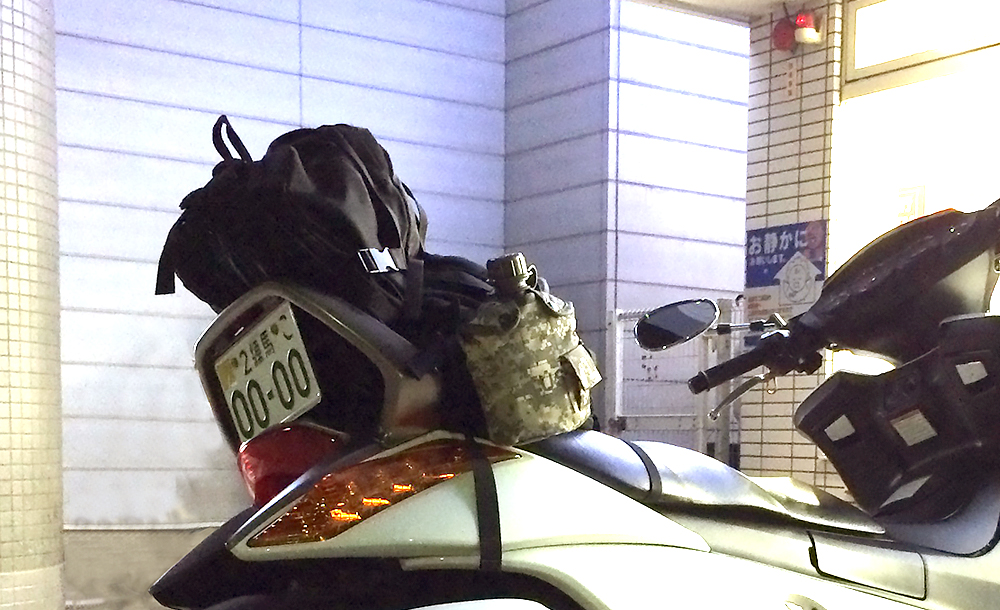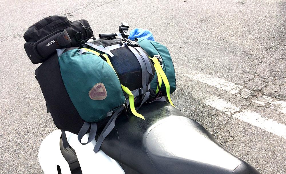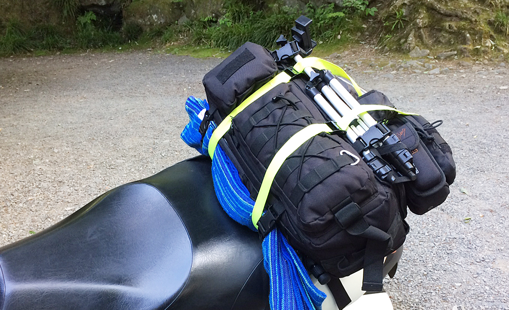 最初はシートバッグを使っていましたが、バイクを横付けできない場所に行くことも増え、バックパックを使うようになりました。装備の小型軽量化とともに、バックパックも小さくなっていきました。