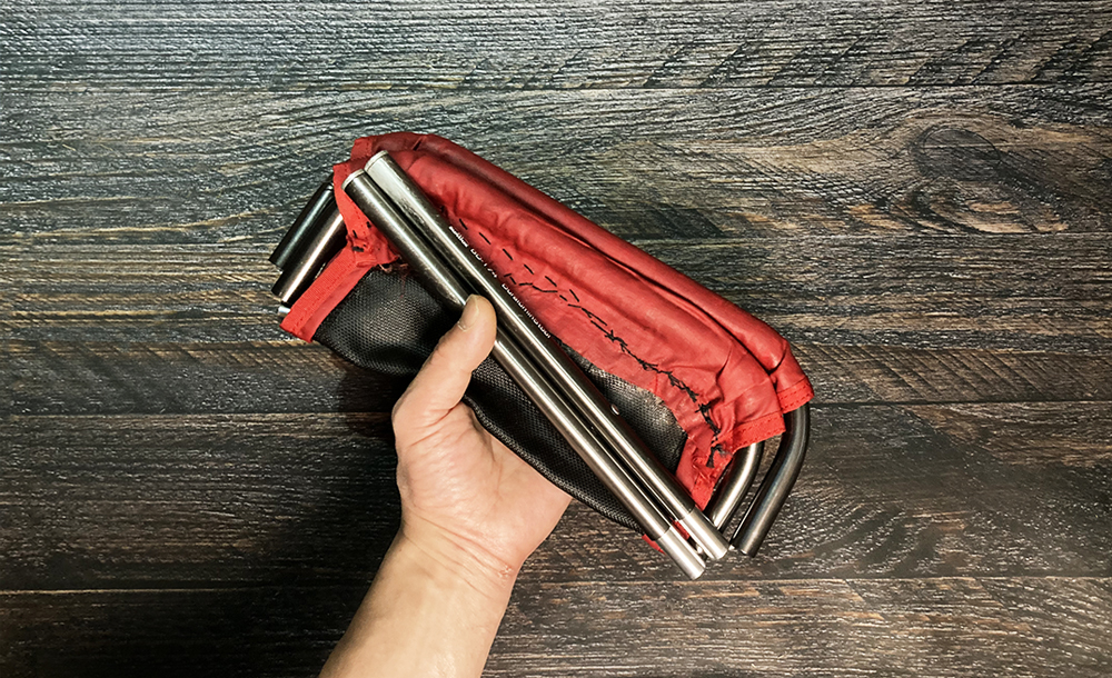 上の椅子とほぼ同サイズで、こちらの脚は容赦なく地面にめり込んでくれるんですが、コンパクトに収納できるんで、こちらを使うことが多いです。