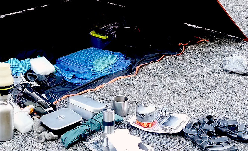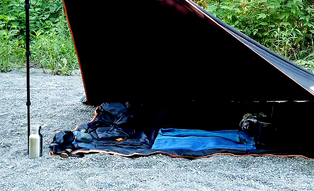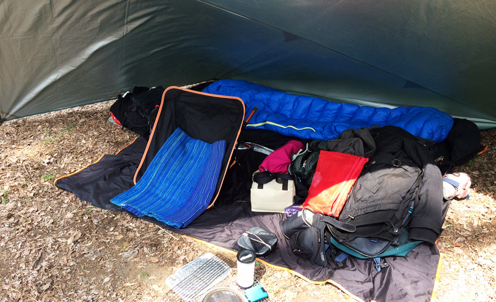 地べたに直座りは、最初の頃は腰が痛くなりました。でも、人間の体ってのは不思議なもんで、しばらく続けていると慣れてきました。地べただとすぐ横にもなれるし、寒い時は下半身を寝袋に突っ込みながら過ごせるんで、実は椅子よりも快適です。