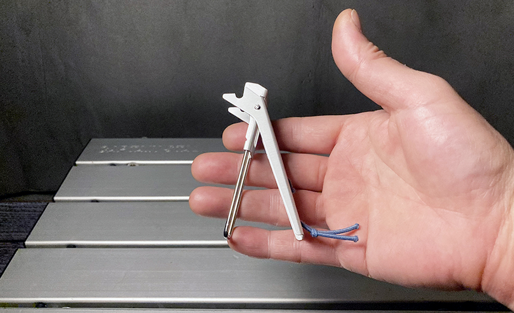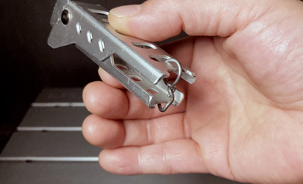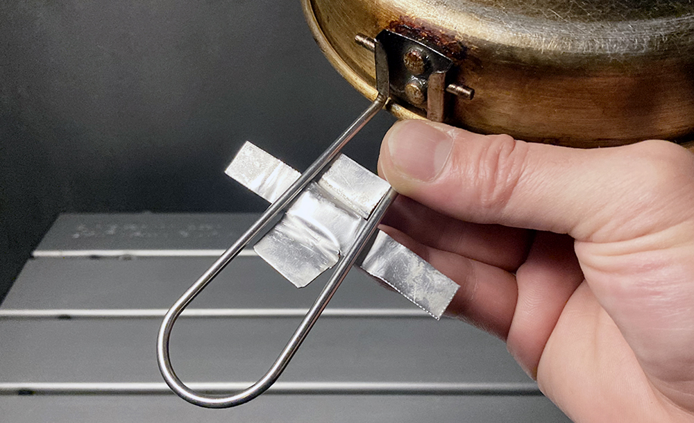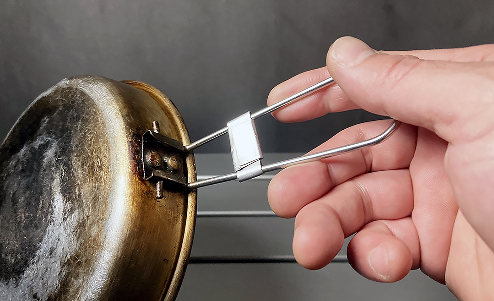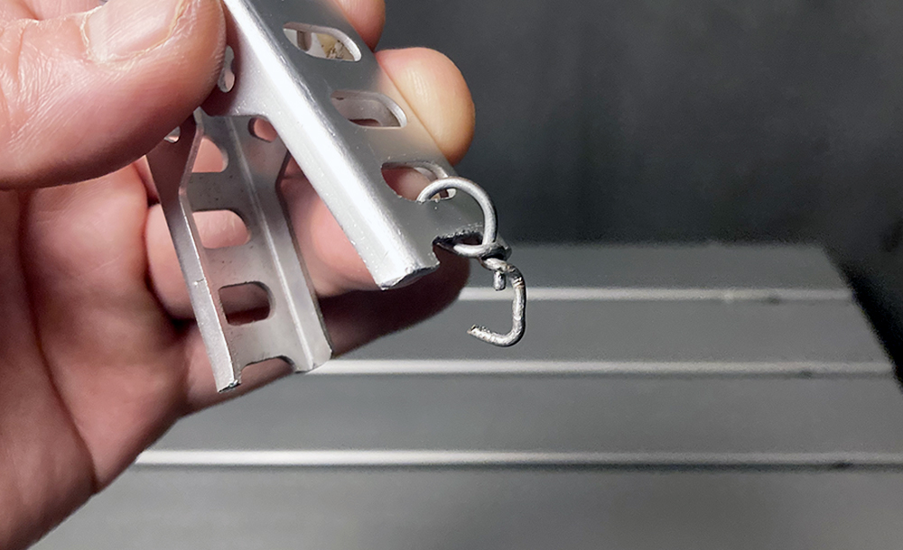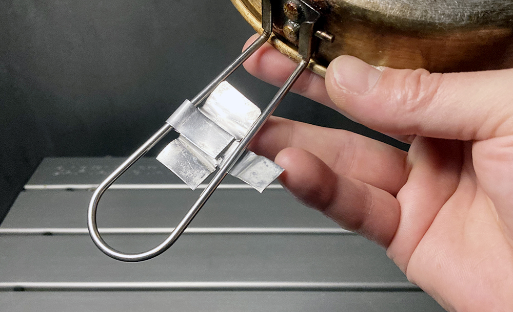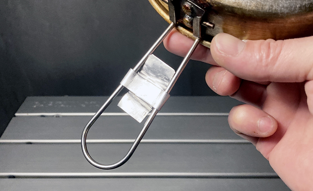 手を離すとバネで勝手に開いてしまうので、針金を加工してストッパーを付けています。