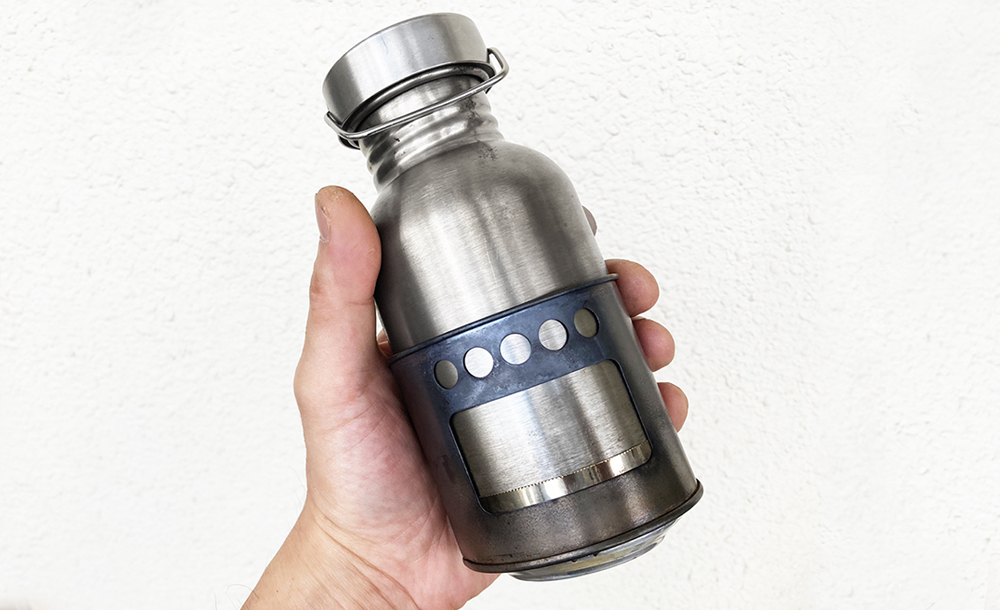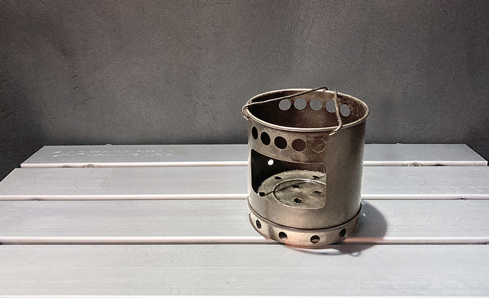 底に空気穴を開け、脚を付け、焚火台としても使えるように改造したSeriaの固形燃料ストーブ。