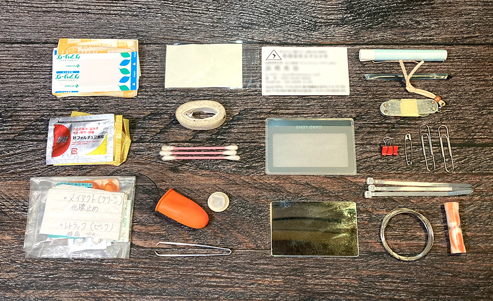 登山などはしないので怪我は主に切り傷用、体調不良の際の口径薬を各種、道具やバッグの修理用など、キャンプ中での応急処置を想定した内容です。