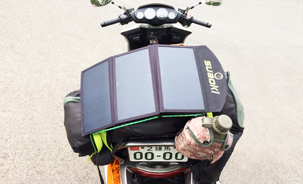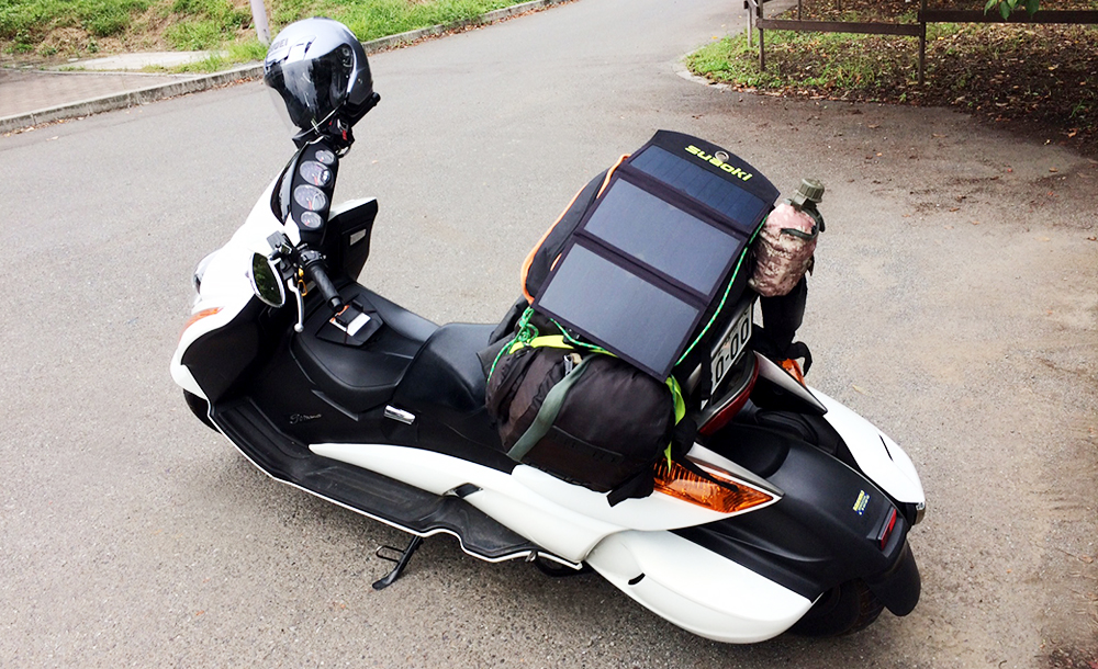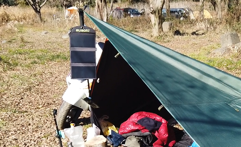 キャンプ中はこんな具合に吊るしておき、移動中はバッグの上に付けて発電。