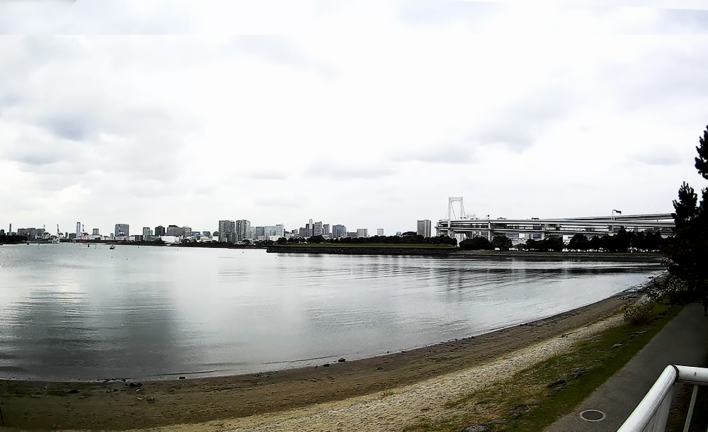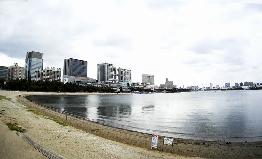 奥に見えるのはレインボーブリッジ、手前は砂浜です。