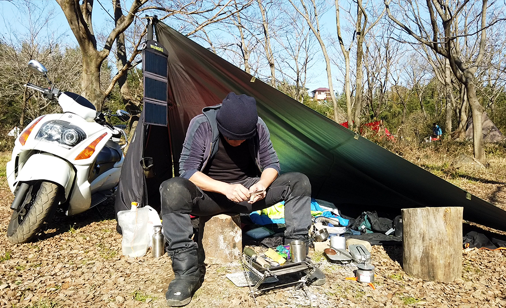 ▷「巾着田でタープ泊&カンスボルで木彫」
